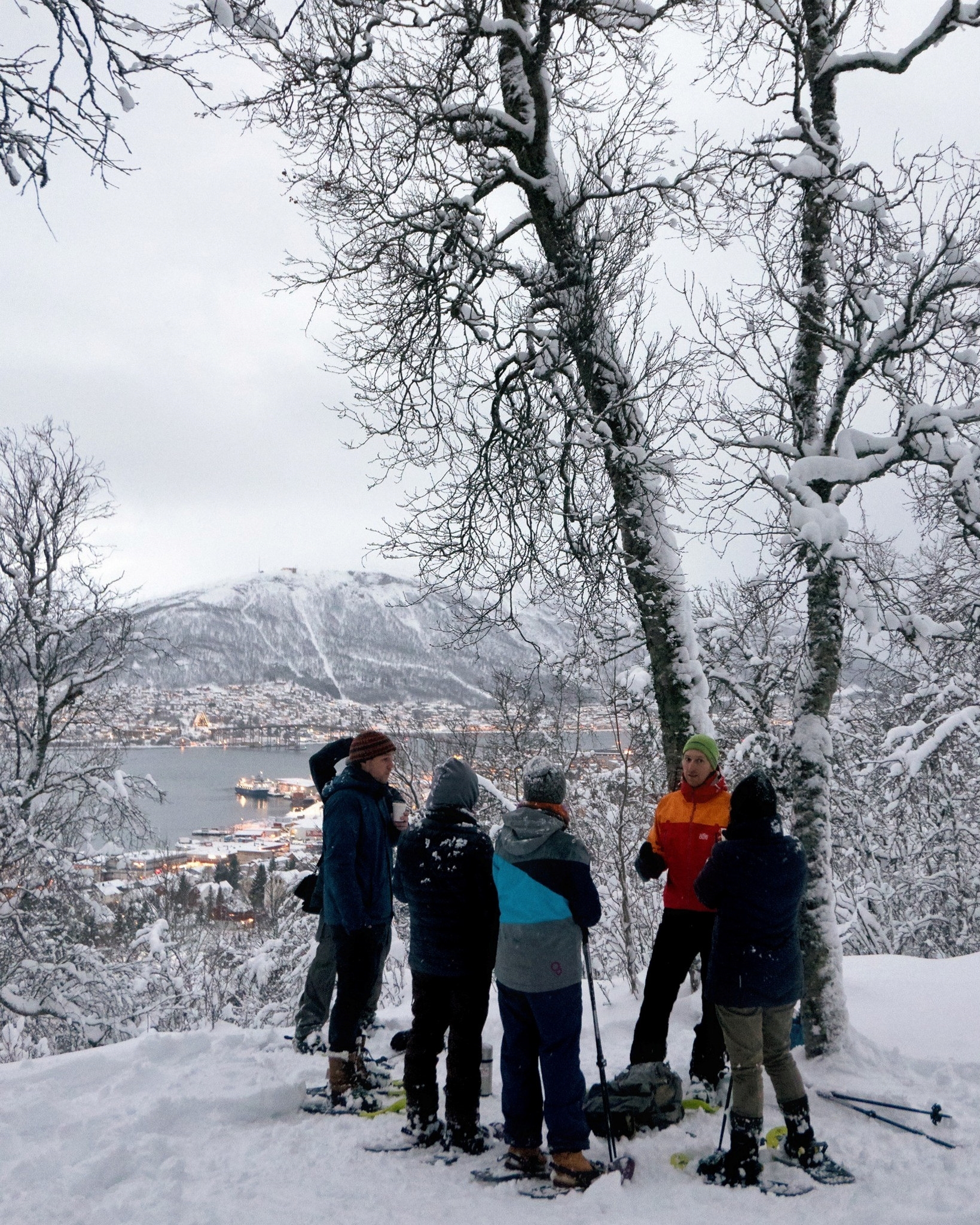 Magne Aarbø, daglig leder Outdoor Tromsø (i oransje jakke) gir en guidet tur i Tromsømarka. Foto: Tromsø Outdoor AS