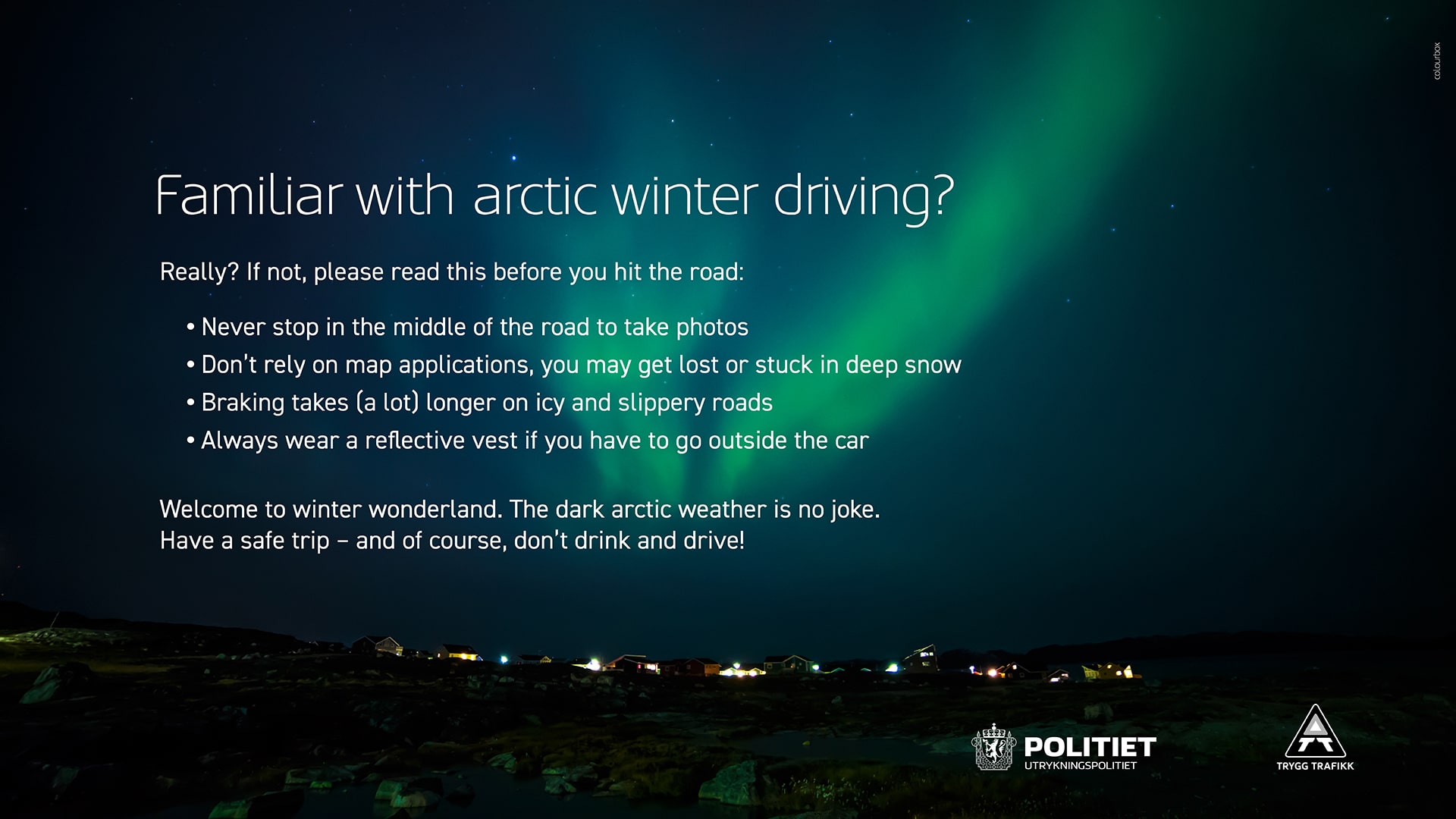 Politiet melder om flere uønskede hendelser og ulykker blant uerfarne vinterturister. For å bidra til tryggere ferdsel, har Trygg trafikk og Politiet utviklet materiell for å spre informasjon og tips til trygg kjøring på arktiske vinterveier.
