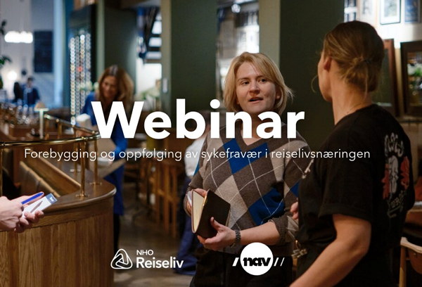Webinar: Forebygging og oppfølging av sykefravær i reiselivsnæringen NHO Reiseliv lanserer i samarbeid med Nav, en webinarrekke i tre deler, som gir ledere konkrete verktøy, nyttige råd og oppdatert kunnskap. 3.–17. mar 2026 Digitalt Digitalt på Teams sykefraværsoppfølging, sykefravær Akademiet, HMS