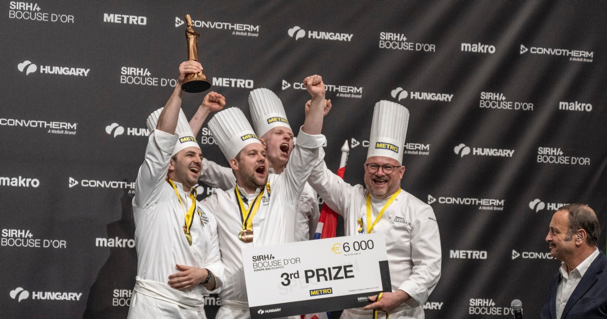 Norges Bocuse-kandidat, Årets kokk 2021-vinner Filip August Bendi, reiser til Lyon med det samme stjernelaget som vant bronsen i Bocuse d’Or Europe i Budapest. Kjernelaget består av Christopher W. Davidsen (coach) og Leon Haarberg Nilsen (commis), med Sven Erik Renaa som lagets president. Foto: Stian Broch