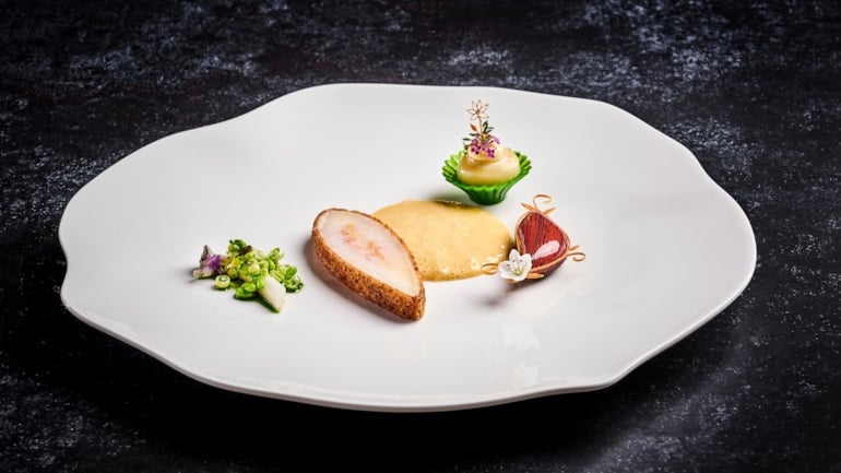 Team Cap sin fiskerett til Bocuse d’Or Europe 2026, anrettet på tallerken med rødknurr, arktisk sjøkreps, kikert-tartelette, artisjokk, vårgrønnsaker og champagnesaus med sjøpiggsvin. Foto: Tom Haga