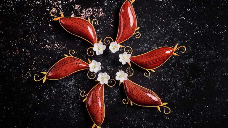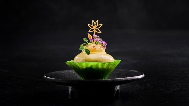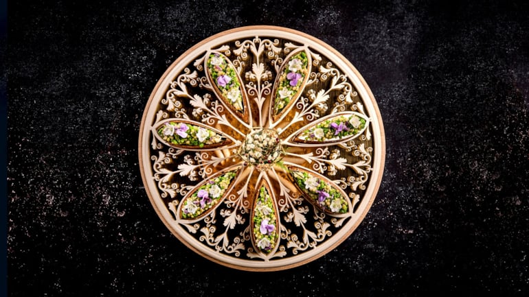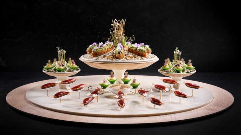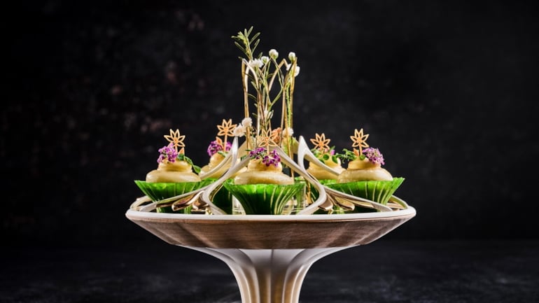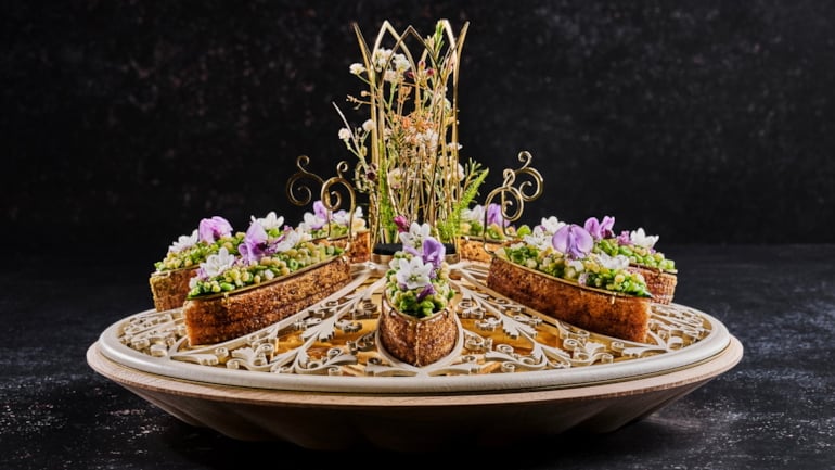 Artisjokk barigoule, garnert med urter og blomster, var ett av elementene i Team Cap sitt fiskefat til Bocuse d’Or Europe 2026. Foto: Tom Haga