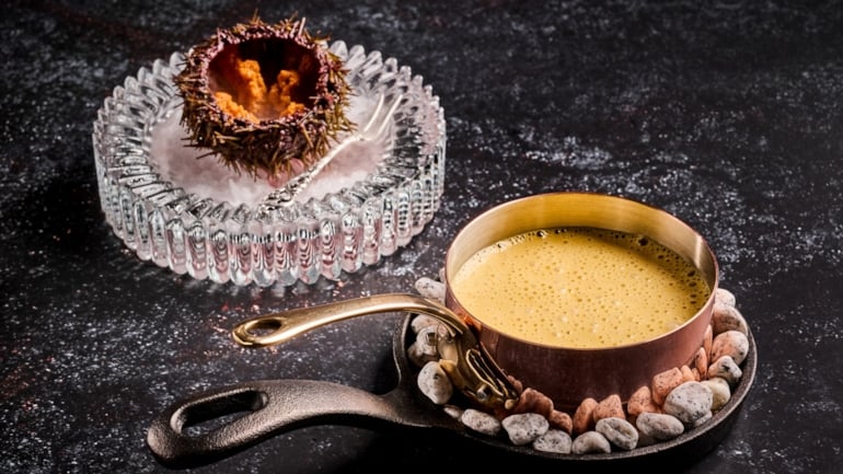 A tribute to Marseile: Kråkebolle chamagnesaus. Del av fiskefatet fra Team Norge i Bocuse d'Or Europe 2026. Foto: Tom Haga
