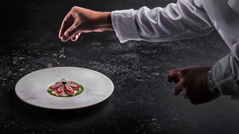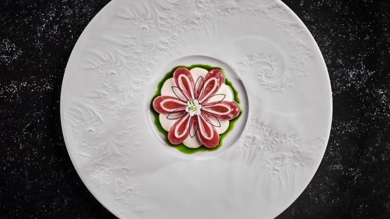 På tallerkenen har Team Cap samlet alle elementene i «Surf and Turf»: håndskåret oksecrudo, mør blekksprut, langtidsbakt hvitløksaioli med norsk villramsløk og Hanasand-tomater med aromatisk tomatgelé. Foto: Tom Haga