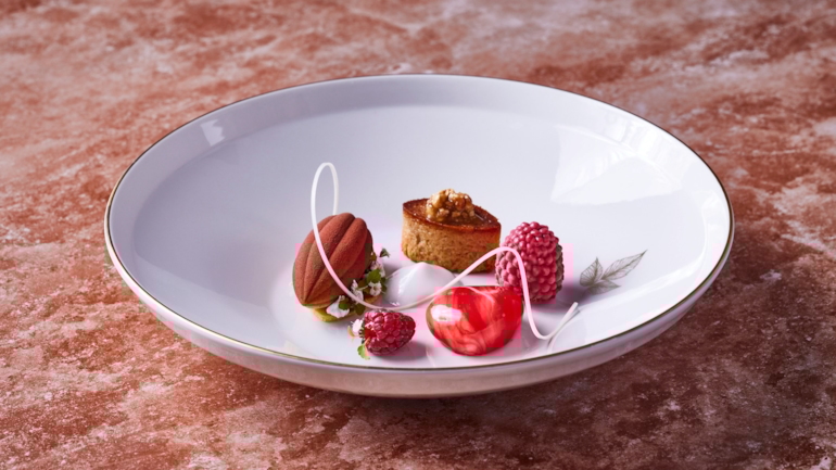 Menyen besto av varm og kald tapas til forrett, et showfat med piggvar, hummer og laks, tørrmodnet biff til hovedrett og en dessert bestående av blant annet sjokolade og bringebær i ulike varianter. Foto: Stian Broch